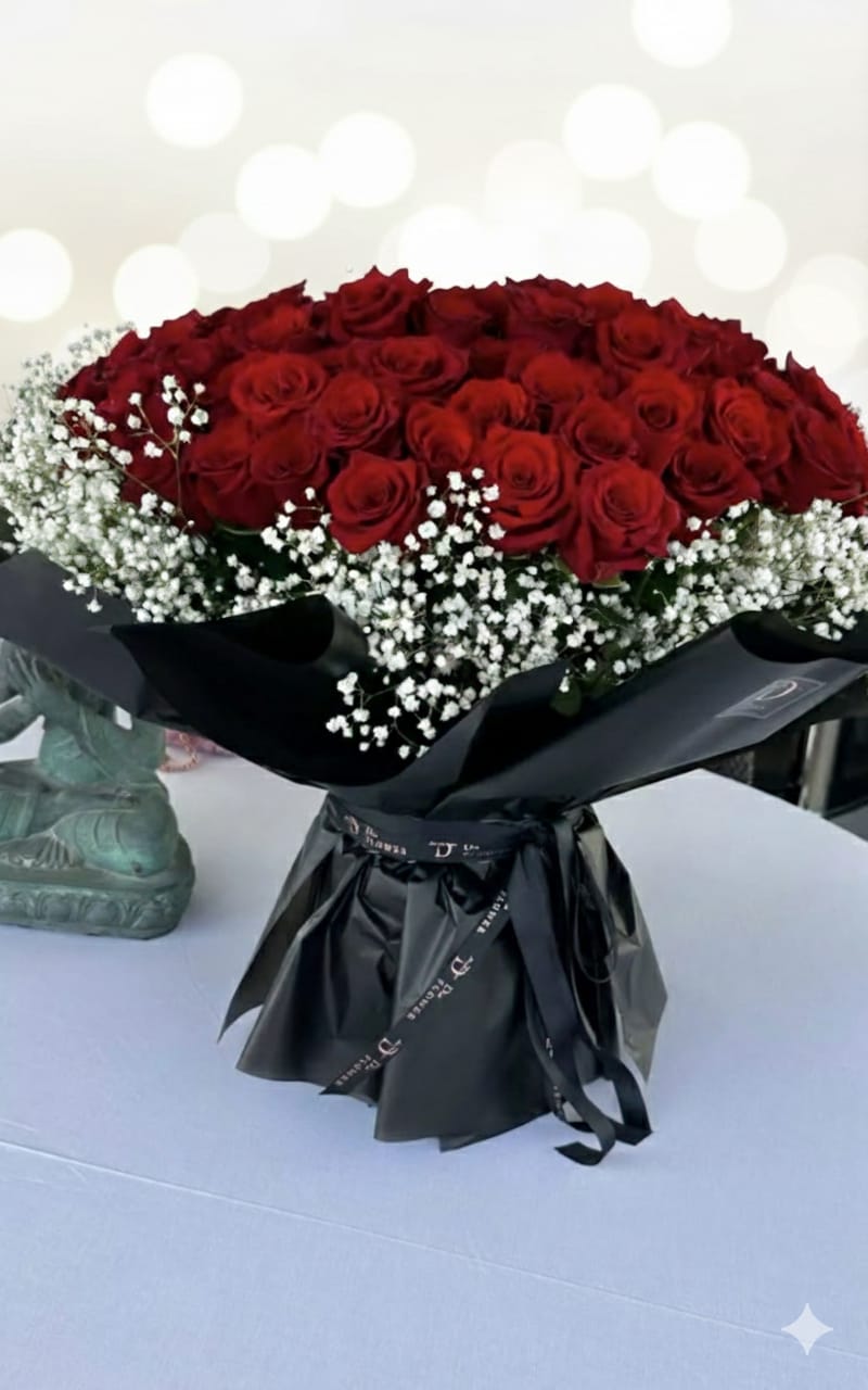 Go grand this anniversary with the ultimate symbol of devotion. FlowerShopKarachi presents a massive, breathtaking arrangement of premium deep-red roses, cushioned with delicate baby’s breath and encased in our signature luxury black wrap. This isn’t just a bouquet; it’s a statement of a lifetime of love.