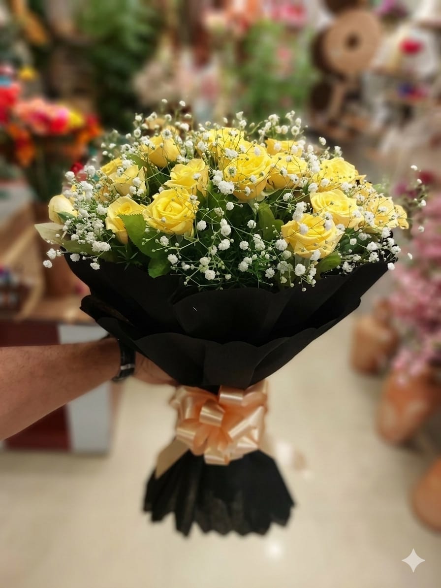 Brighten someone’s day with this premium arrangement of fresh yellow roses, delicately accented with white baby’s breath and wrapped in a sophisticated black matte finish.
