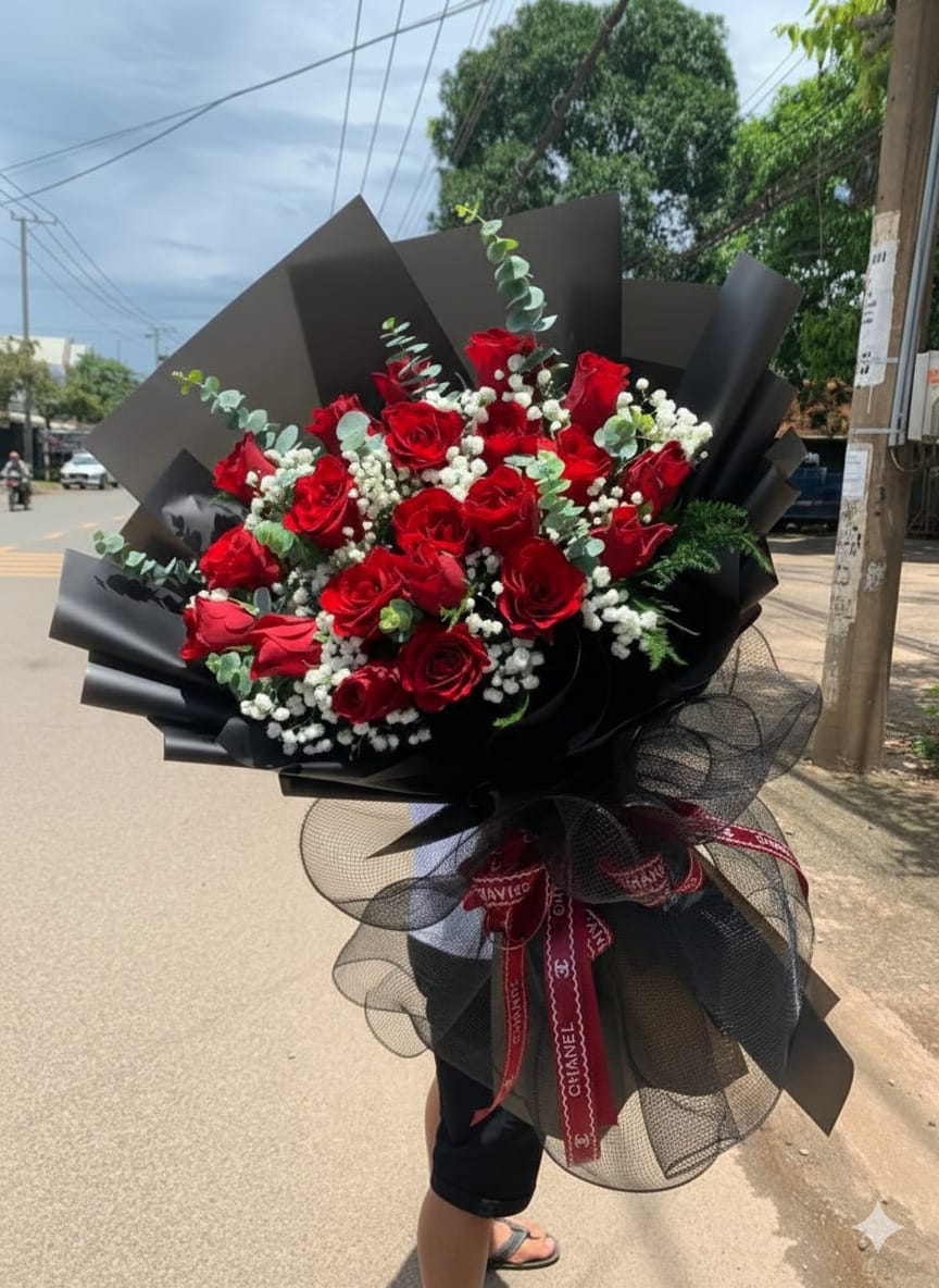 • Luxury Black Wrapping: The flowers are encased in premium, matte black paper which makes the red colors “pop” brilliantly.