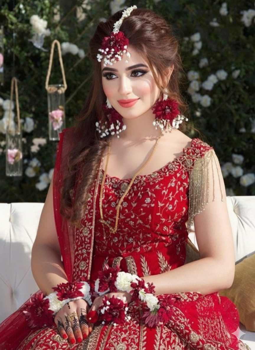 Product Overview: Step away from traditional yellow and embrace the richness of our Velvet Rose Floral Collection. This set is designed for the modern bride who loves the classic combination of maroon and white. It provides a luxurious “velvet” feel that perfectly complements heavy bridal lehengas and intricate henna designs.